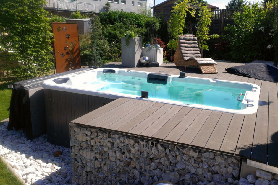Die Outdoor Whirlpools von axopool können in eine Terrasse eingebaut bzw. nach Ihren Vorstellungen verkleidet werden. Gegen den Einbau des Jacuzzi bestehen aus technischer Sicht keine Bedenken. Beim Einbau eines Außenwhirlpools sollten Sie jedoch darauf achten, dass ein Wasserablauf installiert wird, um beim Wasserwechsel ggf. das Whirlpoolwasser aus dem Jacuzzi ablassen zu können. Alternativ können Sie das Wasser auch bequem über eine Tauchpumpe absaugen.