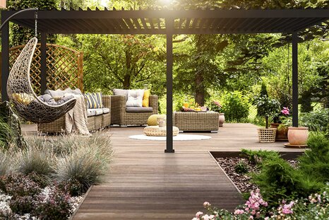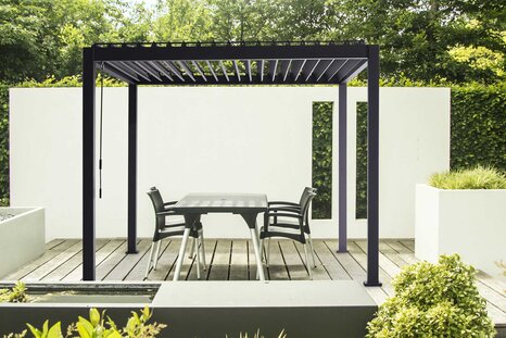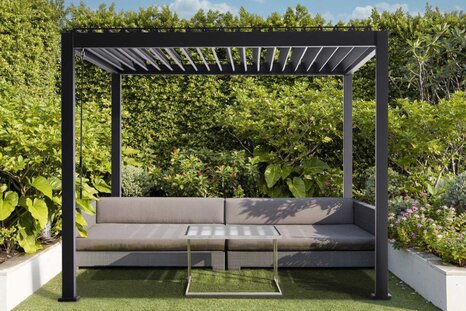 Mit einer Überdachung für Ihren Lieblingsplatz im Garten genießen Sie Schutz: Vor zu viel Sonne, Regen und neugierigen Blicken. Unseren Pavillon aus Aluminium gibt es in verschiedenen Größen – genau passen zu Ihrem Home-Spa. Der zusätzliche Lamellen-Sichtschutz ist optional verfügbar.